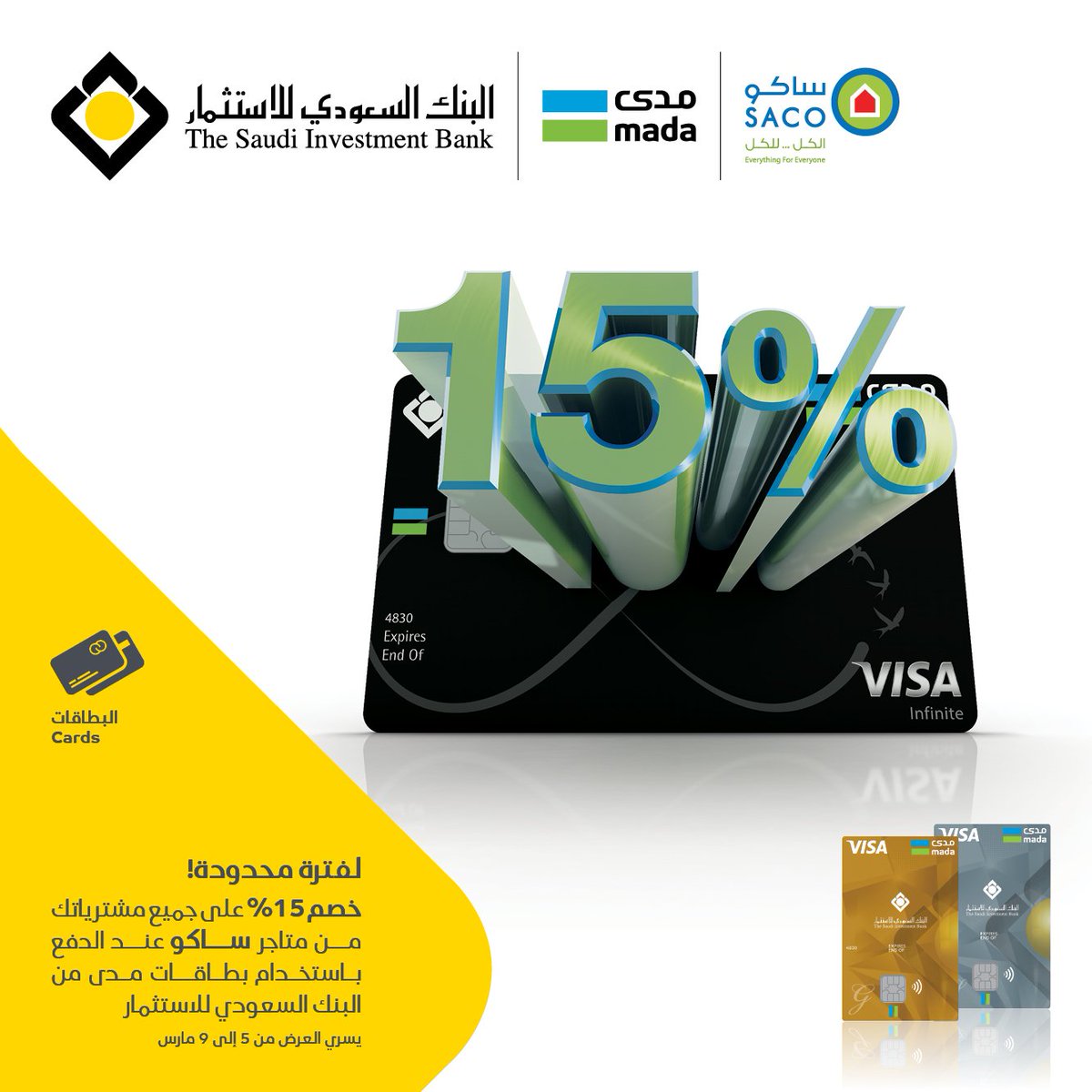 البنك السعودي للاستثمار On Twitter لفترة محدودة خصم 15 على جميع مشترياتك من متاجر ساكو عند الدفع باستخدام بطاقات مدى من البنك السعودي للاستثمار Https T Co E0rj1hvufl Https T Co Pdq2g6v3wu